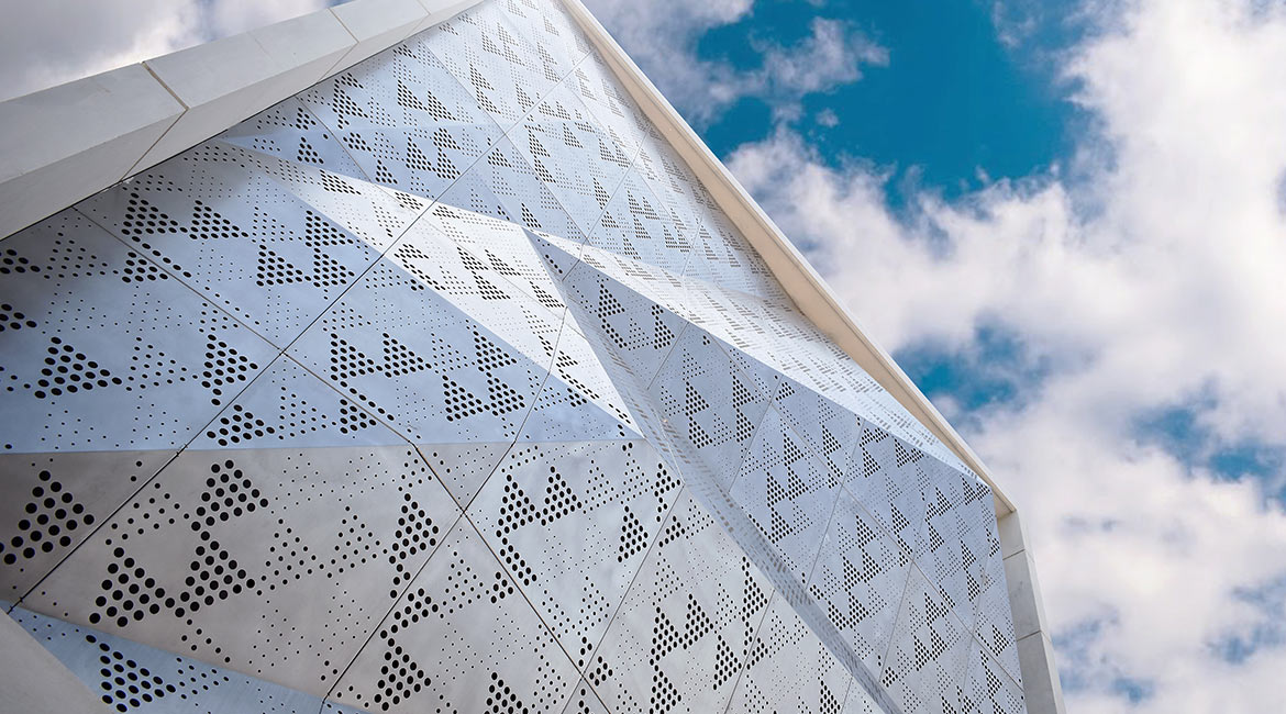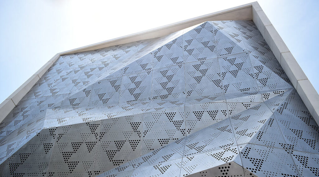 ARishi and associates are one of the most experienced builders in Coimbatore city. Architect Rishi had a challenging facade idea for his new commercial building. Artzinium worked with the architect’s idea for the building facade.The facade is made of Aluminium sheets with perforation artwork, the sheets mounted in different angles to form a multi faceted surface.The complexity of the facade was quite a challenging project for our engineering team, we developed custom made brackets and joineries specific to this project.