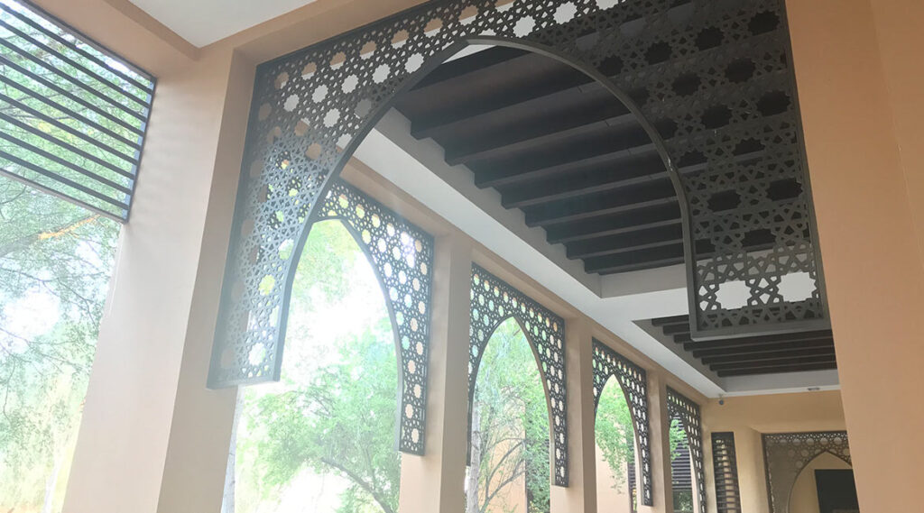 AThis façade was made for an open-air car parking arcade. Every unit of the façade is made of aluminium sheets, the sheets were first laser-cut and then folded for the desired design. All the sheets put together form an interesting pattern with the complete façade consisting of 40,000 units mounted to the main structure.